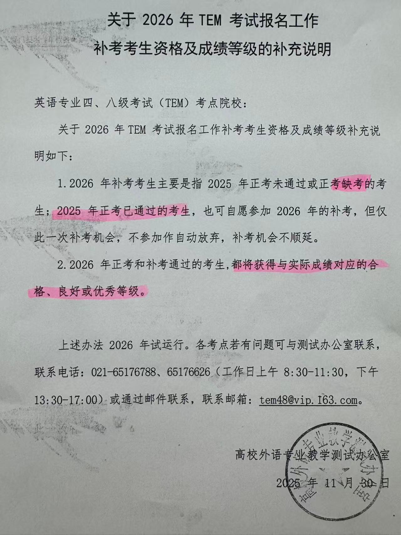 “关于2026年TEM考试报名工作补考考生资格及成绩等级补充说明如下: