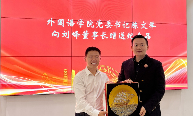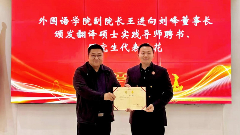 刘峰代表合图教育科技集团向学院捐赠50万元,专项设立王宁人文学术基金。梁燕、刘毓洁共同为刘峰颁发捐赠荣誉证书,陈文举代表学院赠送纪念礼品,王进为其颁发翻译硕士实践导师聘书,研究生代表献上鲜花,表达敬意与感谢。