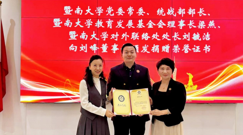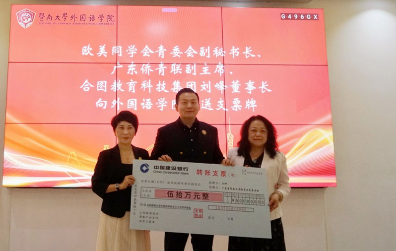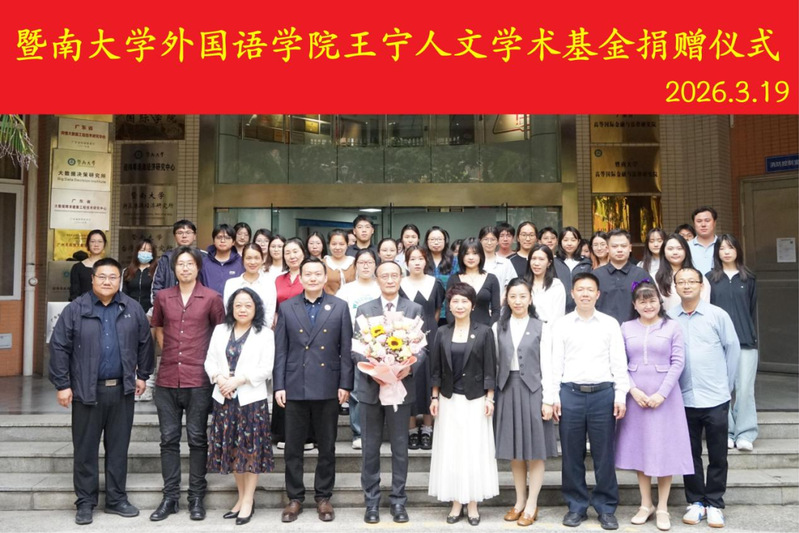 3月19日下午,暨南大学外国语学院隆重举行王宁人文学术基金捐赠仪式。暨南大学党委副书记陈莹,上海交通大学人文艺术研究院院长、教育部“长江学者”特聘教授、国际文学艺术研究院杰出院士王宁教授,广东侨界青年联合会副主席、合图教育科技集团董事长刘峰先生,学校党委常委、统战部部长、暨南大学教育发展基金会理事长梁燕,学校对外联络处处长刘毓洁,合图教育科技集团董事谭立楠,外国语学院院长蒲若茜、党委书记陈文举、副院长汤琼、王进、朱红强及师生代表出席活动。仪式由汤琼主持。