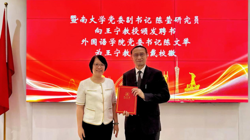 陈莹在致辞中高度评价王宁教授在人文社科领域的卓越成就与国际影响力。她指出,王宁教授受聘为暨南大学讲座教授,将为学院学科发展与国际化建设提供重要引领。同时她对刘峰董事长深耕教育公益、反哺母校的善举致以诚挚感谢,并表示学校将保障基金规范高效使用,助力学院事业稳步发展。随后,陈莹为王宁教授颁发讲座教授聘书,陈文举为其佩戴暨南大学校徽。