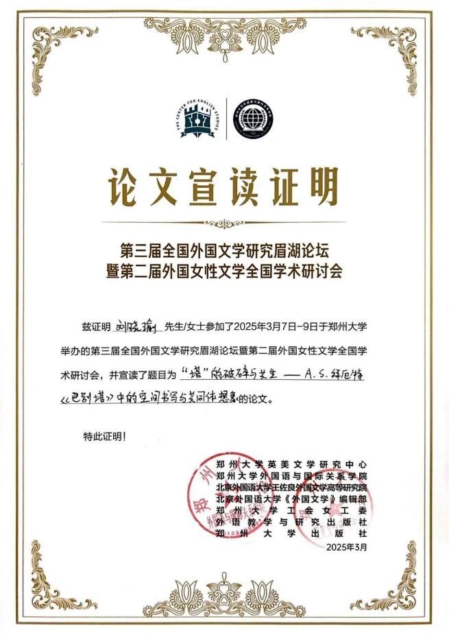 在学术科研领域,刘晓瑜展现出扎实的理论功底与创新思维。她曾于上海交通大学学术工作坊宣读关于英国华人先锋实验诗歌的论文,在郑州大学眉湖论坛探讨英国女性文学中的共同体书写,并发表国际期刊论文,聚焦空间理论下的女性命运分析。此外,她参与慕课课程《中西经典对话》出海项目的助教工作,提升跨文化沟通能力。这些经历不仅彰显了她对学术的执着追求,更体现了她在外国文学研究领域的潜力与独特视角。