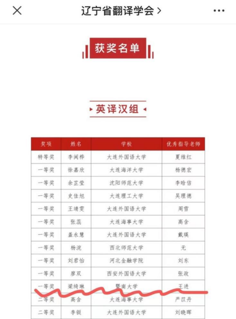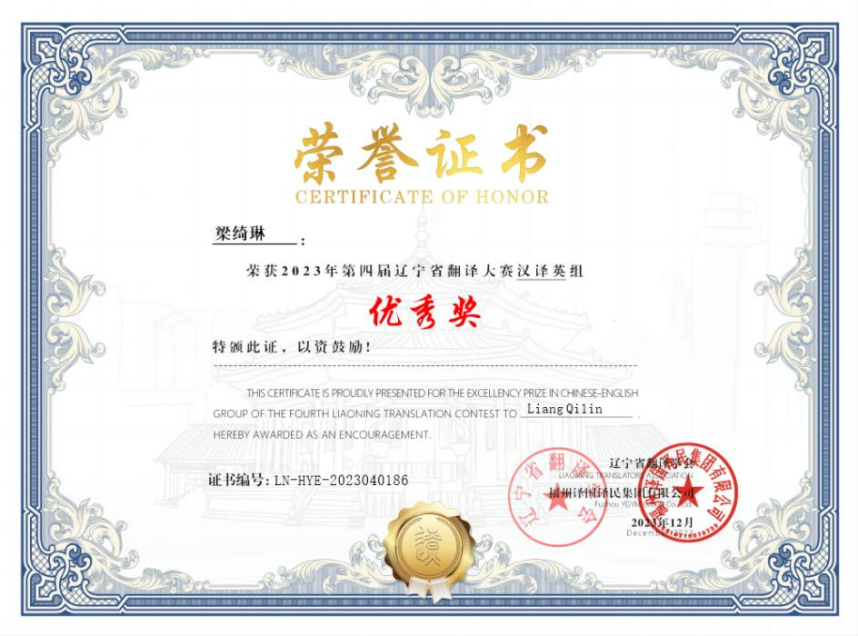 第四届辽宁省翻译大赛汉译英组优秀奖