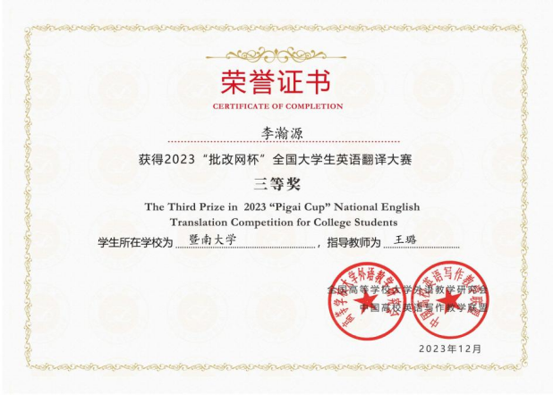2024年CATTI杯全国翻译大赛初赛三等奖