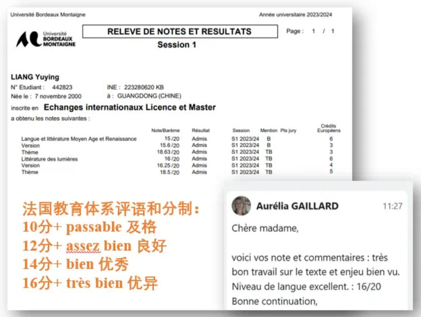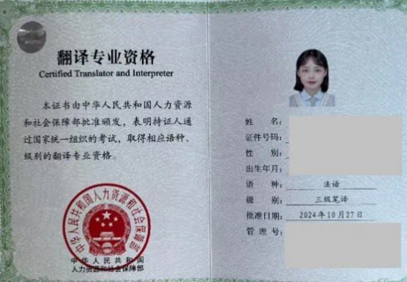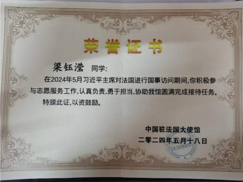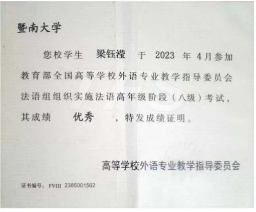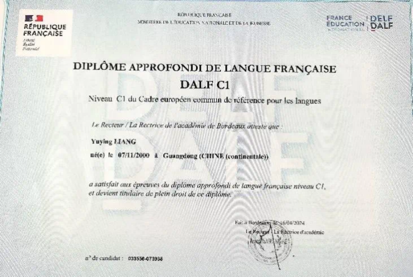 梁钰滢持有法语专四、专八优秀证书、TCF C1证书、DALF C1证书、CATTI三级笔译证书和商务法语教师资格证
