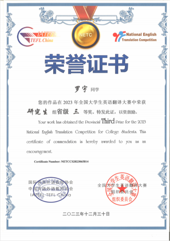 罗宇,男,中共党员,本科毕业于华南农业大学外国语学院商务英语专业,暨南大学外国语学院2023级英语笔译专业硕士研究生,导师为朱红强教授,获评暨南大学2025年优秀毕业研究生称号。