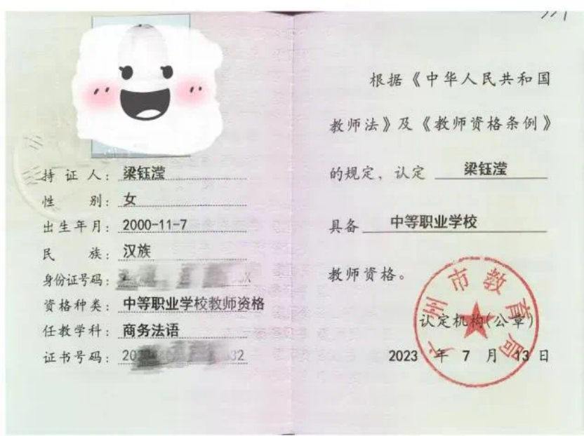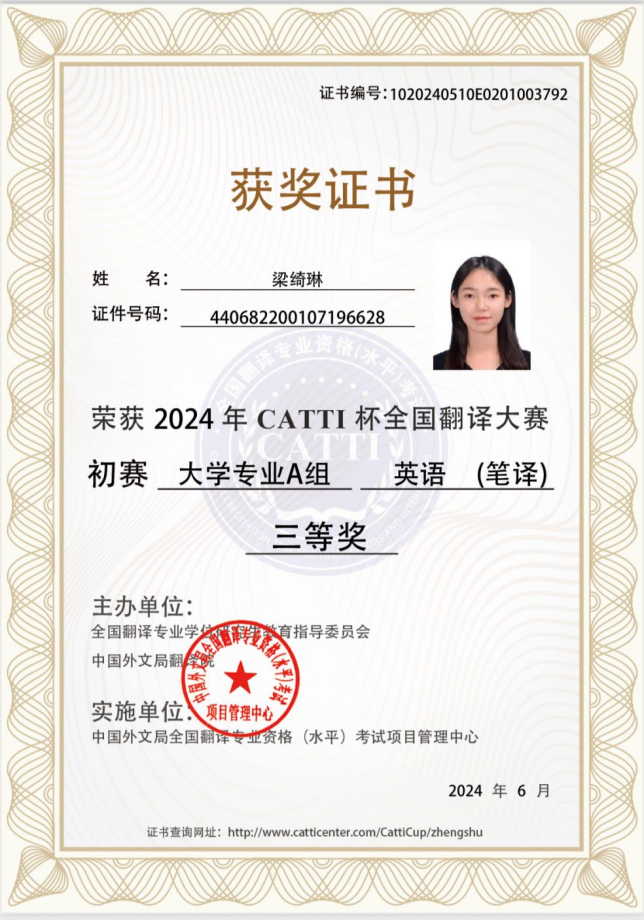 梁绮琳目前持有英语专四(优秀)、专八(良好)、CATTI二级笔译、高中英语教资、BETT中级、FLRB中级、普通话水平证书(二甲)等各类资格和技能证书。