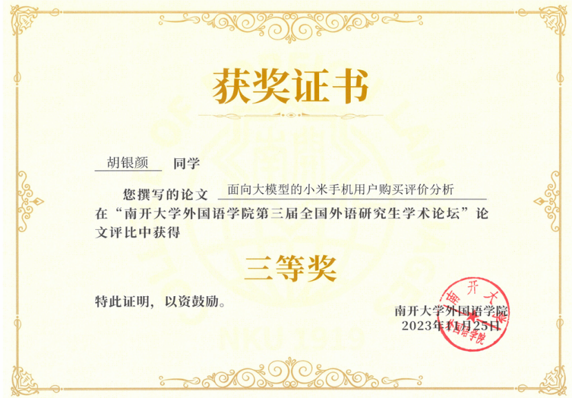 南开大学外国语学院第三届全国外语研究生学术论坛论文评比获得三等奖