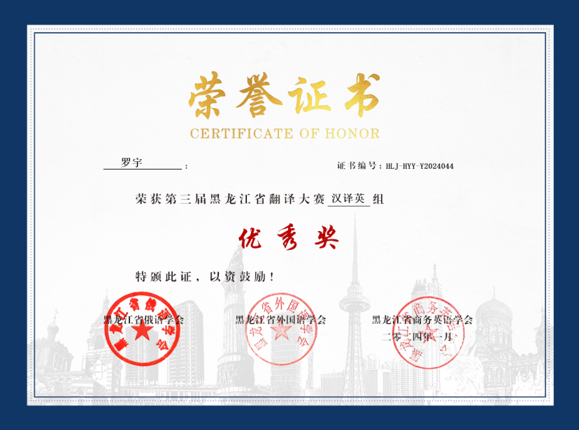 第三届黑龙江省翻译大赛汉译英组优秀奖
