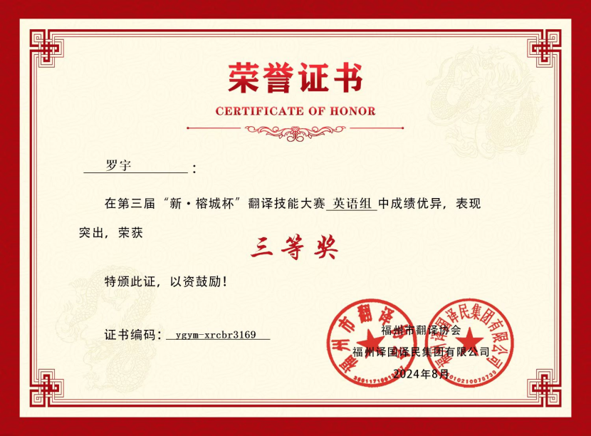 第三届“新·榕城杯”翻译技能大赛三等奖