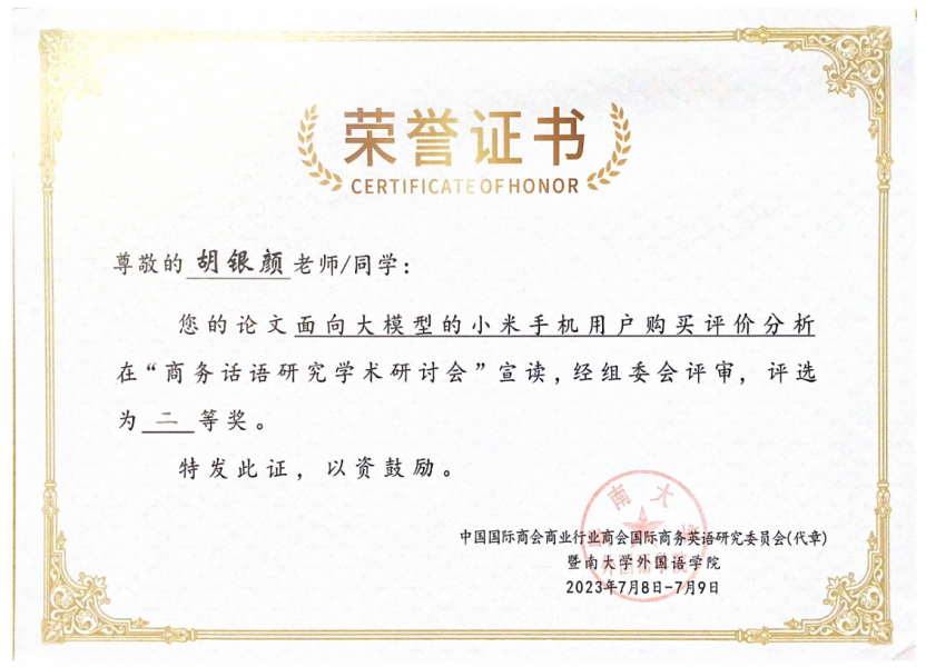 学术论文《面向大模型的小米手机手机用户购买评价分析在“商务话语研究学院研讨会”》评选为二等奖