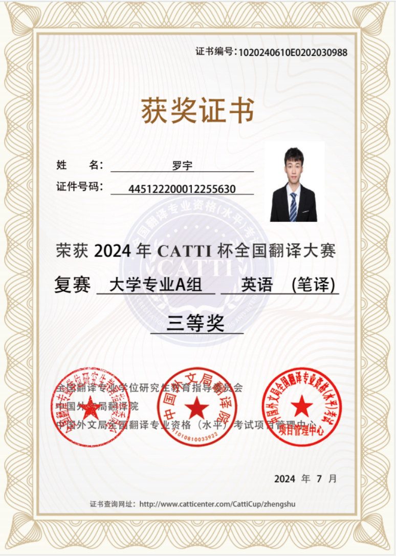 罗宇目前持有英语专四、英语专八、CATTI二级笔译、CATTI三级笔译等专业资格证书。高中英语教师资格证、普通话二甲证书、全国计算机二级证书。