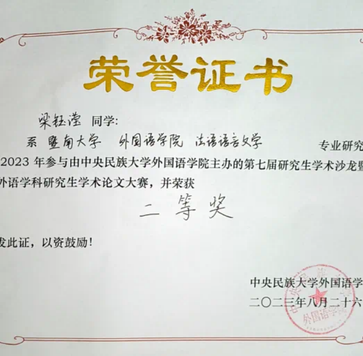 梁钰滢曾获中央民族大学外国语学院全国外语学科研究生学术论文大赛二等奖和三等奖,发表两篇期刊论文,其中《传统与现代的碰撞:从<一封如此长的信>看非洲女性的生存困境与出路》一文与导师合作发表于《世界法语区发展研究》。