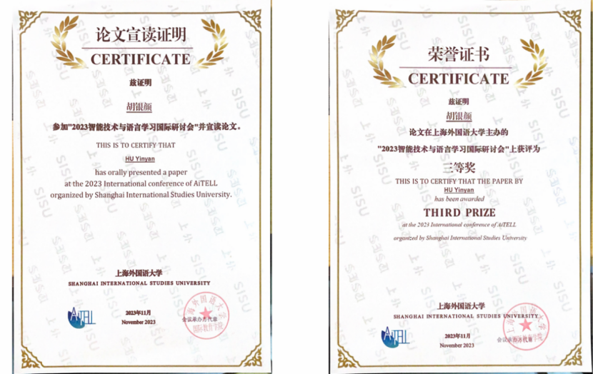 胡银颜以“复合型科研人才”为目标,在新文科与人工智能融合的浪潮中深耕语言学理论,自主学习并掌握Python编程、R语言、机器学习等技术,熟练运用大模型与数据分析工具,构建起“理科思维+语言学理论”的创新研究框架,在国际期刊发表了两篇论文,并携多篇原创论文受邀参加了两场国际性、六场全国性学术会议。赴上海交通大学参加了“数据科学与二语研究国际研讨会”,参会论文曾受C刊编辑约稿邀请;前往上海外国语大学参加“智能技术与语言学习国际研讨会”并作为独立作者获奖;还参加了第八届全国话语语言学学术研讨会、全国研究生高端学术论坛等六个全国性学术会议。