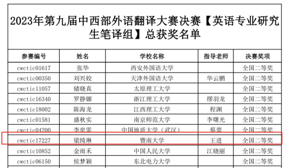 梁绮琳,女,中共党员,本科毕业于广东培正学院英语专业,暨南大学外国语学院2025届英语笔译专业硕士研究生,导师为王进教授,获评暨南大学2025年优秀毕业研究生荣誉称号。