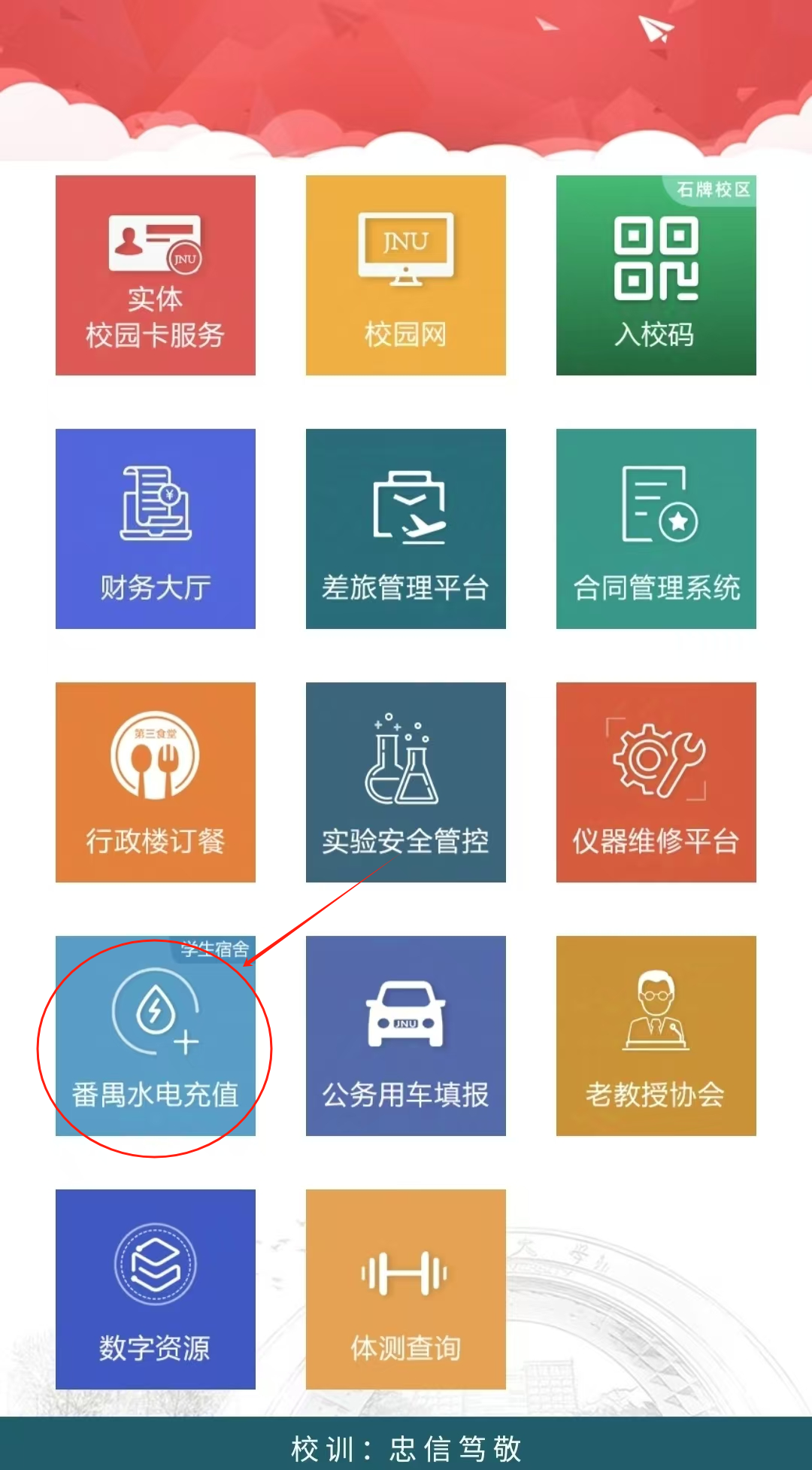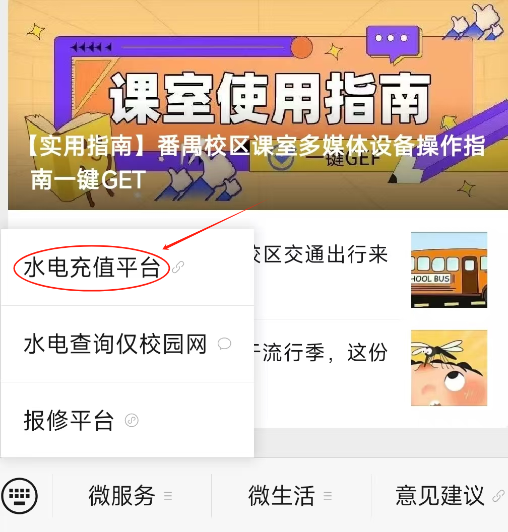 进入“暨番微生活”公众号,选择下方导航栏“微服务”,点击“水电充值平台”即可进行充值。