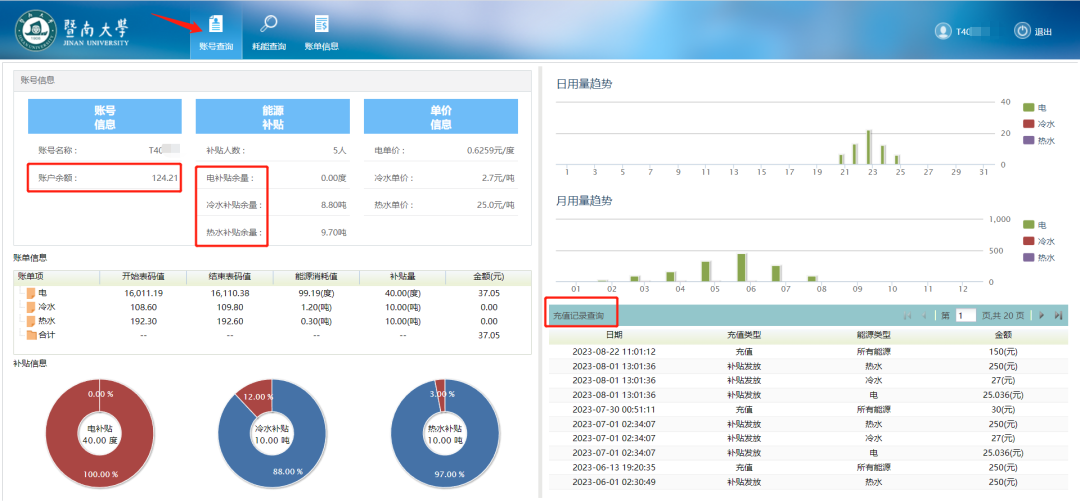 同学们可通过校园网登陆宿舍水电费查询网址https://pay.jnu.edu.cn/jnushouyintai/pyxssssdf/pay,输入本人JNUID即可查询宿舍水电费使用情况及余额。