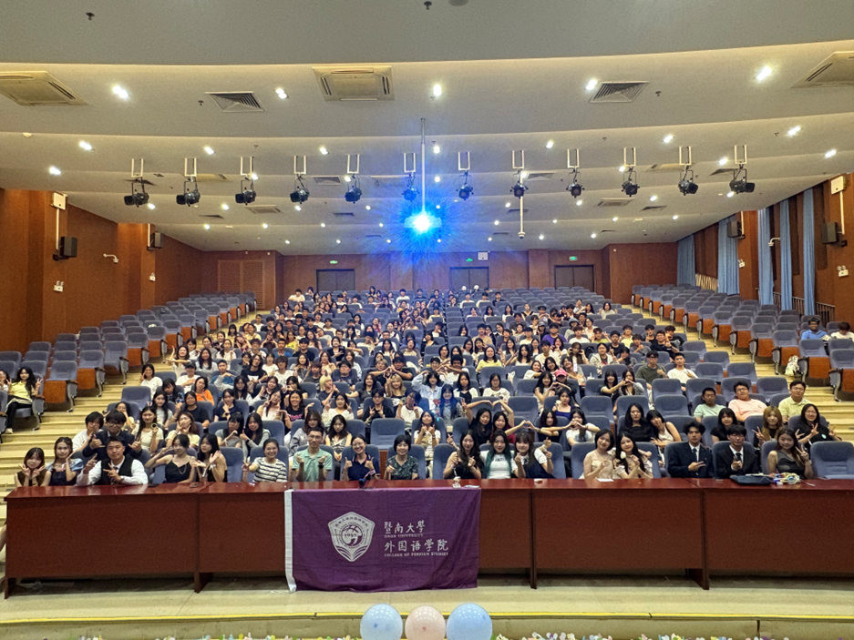 随着结营仪式圆满落幕,外国语学院2025级新生为期14天的新训、军训告一段落。为帮助2025级外院新生增强情感连结、更好地融入外国语学院这一温暖的大家庭,9月28日晚,“‘新’动不已,‘语’见世界”主题迎新晚会在暨南大学番禺校区教学大楼201顺利举行。学院2025级本科班主任代表商务英语国际班班主任彭红兵老师,辅导员艾美玲老师、李鹏老师,兼职辅导员梁明燕出席晚会。