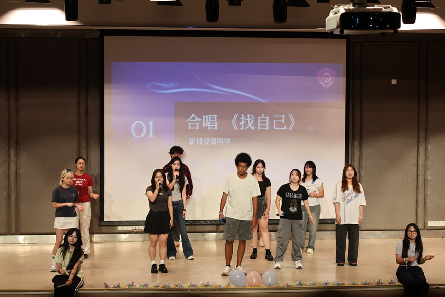 晚会开场,新训观训同学带来合唱节目《找自己》,传达了对同学们在未来四年里找到属于自己的热爱的美好祝愿,迅速点燃了现场热烈的气氛。